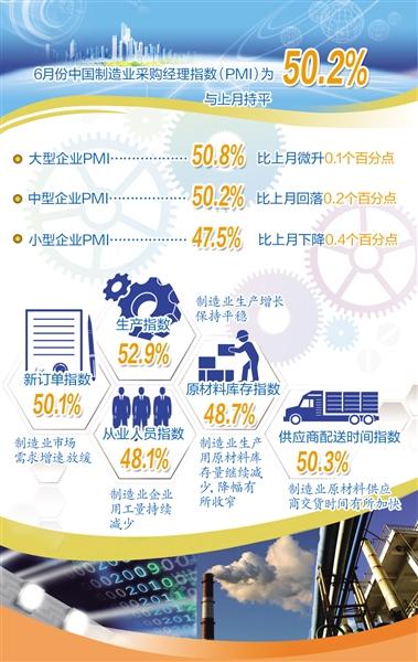 数据显示,6月份,PMI为50.2%,连续4个月位于荣枯线上方;非制造业商务活动指数为53.8%,比上月上升0.6个百分点。