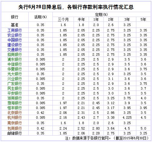 央行宣布,自2015年6月28日起下调金融机构人民币贷款和存款基准利率,以进一步降低企业融资成本。其中,金融机构一年期贷款基准利率下调0.25个百分点至4.85%;一年期存款基准利率下调0.25个百分点至2%;其他各档次贷款及存款基准利率、个人住房公积金存贷款利率相应调整。调整之后的三个月、半年、二年、三年的整存整取定期存款基准利率分别为1.6%、1.8%、2.60%、3.25%;活期存款基准利率仍为0.35%。
