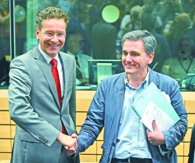 欧元集团主席戴塞尔布卢姆(左)与希腊新任财政部长察卡洛托斯握手。