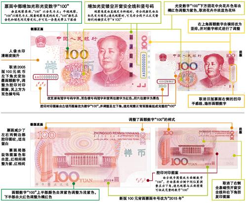 据介绍,2015年版100元纸币增加了防伪性能较高的光彩光变数字、光变镂空开窗安全线、磁性全埋安全线等防伪特征,提升了人像水印等防伪性能,改变了原有的冠字号码字形并增加了竖号码,根据防伪技术的新发展,取消了2005年版100元的光变油墨面额数字、隐形面额数字、凹印手感线3项防伪特征。总体来看,防伪技术水平有明显提升。