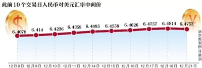 12月21日早间中国外汇交易中心公布数据显示,当日人民币对美元汇率中间价报6.4753,相比于前一交易日上调61点,从而结束了此前连续十个交易日的连续下跌。
