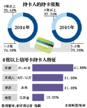 调查显示,持有4张以上信用卡的持卡人在年龄方面主要集中在31岁至40岁之间,以江苏、浙江、北京和上海四地的人最多,年收入主要集中在6万元至20万元,尤其以6万元至12万的人最多,学历主要集中在本科。