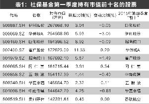 从第一季度社保基金持股市值较大的前十家上市公司来看,同仁堂、省广股份、华夏幸福被增持,贵州茅台被持平,伊利股份、巨化股份、五粮液、中南传媒、招商蛇口、华侨城A被减持。持股比例最高的是省广股份,比例为11.33%。持股比例增加最多的是同仁堂,增加0.34个百分点。和2015年第四季度相比,伊利股份、华侨城A、巨化股份、省广股份、招商蛇口、同仁堂、五粮液、华夏幸福、中南传媒共9只股票维持“前十”的位置,贵州茅台新入围。
