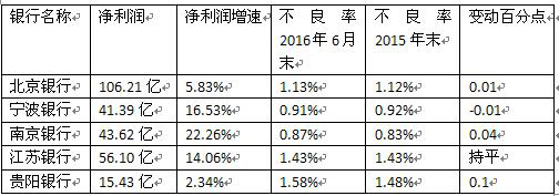 净利润增速最高的是南京银行,达22.26%。其次是宁波银行16.53%,排名第三的是江苏银行14.06%,北京银行排名第四为5.83%,最低的是贵阳银行2.34%。