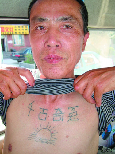 “当我一头撞向墙壁的时候,看守所里的一些好心人赶紧将我抱住,并劝我,如果死了,就没有机会洗冤了。”陆金说,他打消了寻死的念头后,用了两天的时间,用缝衣针在自己的前胸刺上了“千古奇冤”四个大字,在字的下面又刺了一个闪闪发光的太阳,他相信法律一定会还他一个公道。