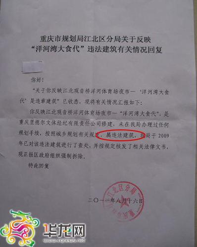 采访中,王女士向记者提供了一份江北区规划分局今年8月16日所作的书面回复材料,这份材料显示,洋河湾大食代建筑由重庆里德尔文体经纪有限责任公司修建,未办任何规划手续,属违法建筑。2009年就已查处,责令限期拆除。