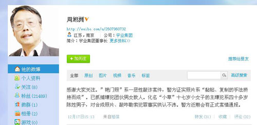 宇业集团董事长周旭洲17日在其新浪认证微博上表示:“艳门照”系一恶性敲诈案件,警方证实照片系“黏贴、复制的手法拼接而成”,已抓捕嫌犯团伙男女数人,化名“小草”十七岁小女子的主嫌犯系四十多岁陈姓男子,对合成照片、敲诈勒索犯罪事实供认不讳,警方近期会有正式案情通报。