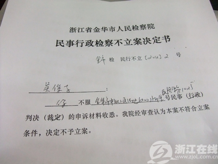 随后,吴俊东不服判决,在律师团的支持下,向金华市人民检察院提出抗诉申请。金华市人民检察院经审查,日前已经作出民事行政检查不立案的决定。(记者施宇翔 郎豫风)