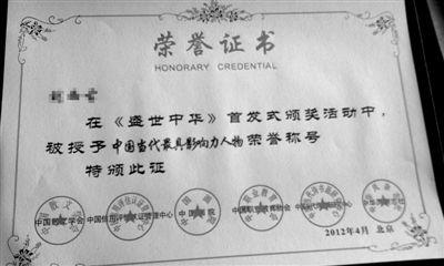 今年春节过后,他频繁接到电话,对方自称是“盛世中华”组委会工作人员,反复告知他位列“全国当代十佳英才人物”。