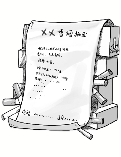 推销单的“导语”各有千秋,比如“品牌漏税香烟”、“礼品回收香烟”,有“实诚的”干脆直说:“您说,香烟不就是抽个面子吗,我公司提供顶级高仿……”