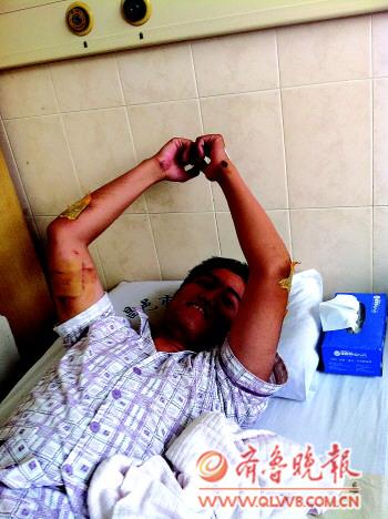 5月28日下午,记者在昌邑市人民医院见到了董生,他的头和胳膊上有多处伤口,大腿和屁股上的伤也比较严重。换下来的警服上,血迹斑斑,警裤早已在拖行中磨烂。