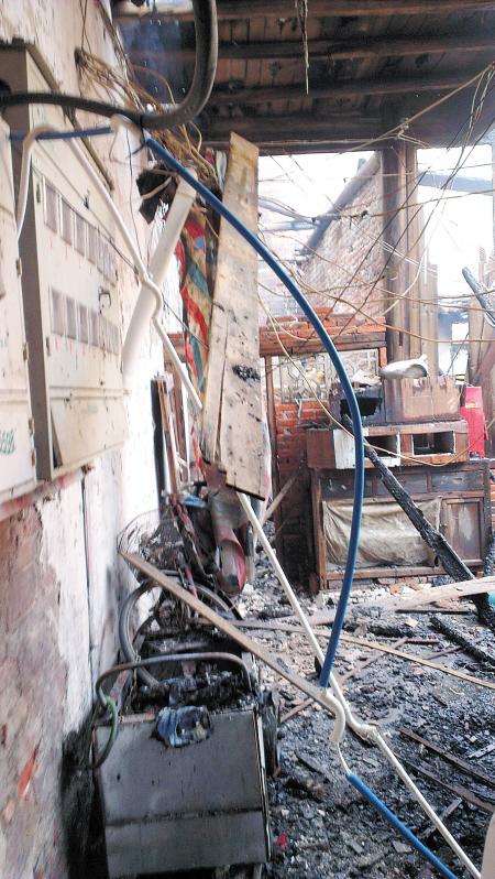 昨日上午,被烧过的地方一片狼藉,还不时有烟冒起。 朱珊珊 孙占锋 摄影报道