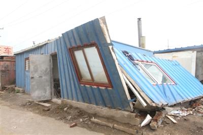 14时15分,记者赶到事发现场。发生爆燃的房屋是征仪路大众新城小区二期226栋对面的一处简易彩钢房。彩钢房因爆燃一面墙体已发生严重倾斜,部分房顶也已脱落。彩钢房窗户的玻璃破碎,附近堆放着被火烧过的屋内物品。透过已变形的房门,记者看到屋内散落着一些石料。据附近居民介绍,这处彩钢房是一处石料加工点,房主叫王英宝,从去年冬天开始在这里做一些大理石加工生意。
