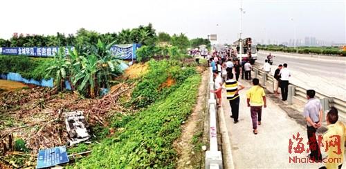 昨日下午5时10分许,一辆白色豪车驶过福州橘园洲大桥后,眼看就要上引桥时,竟向路边护栏撞去,一名50多岁的女村民被撞飞,从引桥与路面连接处的缺口翻下桥,当场身亡。豪车也紧跟着冲出缺口,四脚朝天坠下五六米深的坡底。