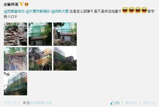 6月26日上午,新浪微博网友施怀基发布博文,其内容为“拥有宅基地证,有国土局证明,但因为家里只有一个弱女子,今日双廊镇政府要对双廊李某的房子进行强拆。李某无奈,拎着菜刀,等候镇政府来拆迁。她要誓死保卫自己的房子。据悉,靠洱海的一边,有许多领导和名人违规建房,但镇政府瞄准一个弱女子的合法地基动手,逼出一个拼命三娘,耐人寻味”,并附有七名群众手持菜刀、锄头等工具的照片两张。