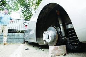 昨日早上8点左右,家住贤士湖附近的市民许先生正准备出门。他走到路边的停车位一看,前一晚上临时停在路边的新车被人“弄残”了。“后面两个轮子全被卸掉了。”许先生告诉记者,这辆大众牌的汽车是他一个月前买的,13日晚上8点回家时,他把车停在了路边。记者看到,这辆车后轮的位置下垫了两块砖头,固定轮毂的螺帽也散落在地上。
