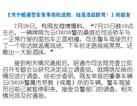 下午,昭通市人民政府新闻办公室通过人民微博的官方账号@微昭通 迅速作出回应,原文如下:昭通接到相关情况通报后,昭通市司法局党委立即召开专题会议研究决定成立调查组,就网络反映的情况进行调查。经初步查明,网友举报的肇事车辆云CD030警属市劳教(戒毒)所的车辆,警车驾驶员目前已被暂停职务,接受交警部门的调查。相关情况将及时通报。(李娜)