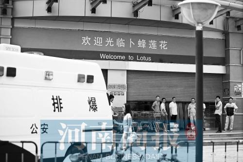 昨天上午11点多,卜蜂莲花超市门口停有排爆车辆,超市入口处贴有“消防演习,暂停营业”的告示 河南商报记者 邱晓峰/摄