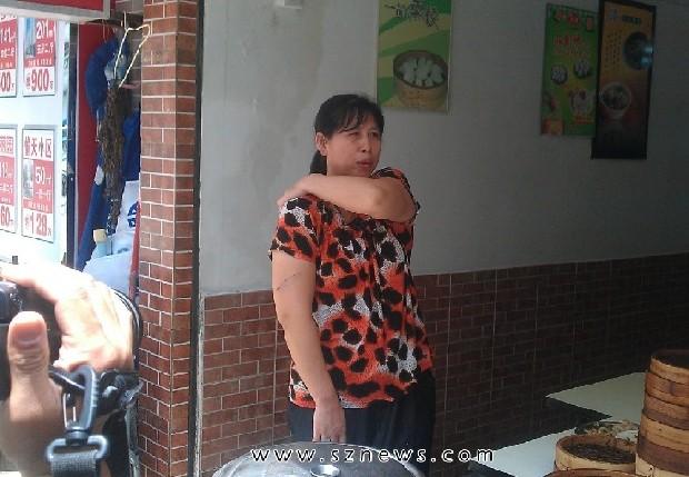 小吃店老板蔡女士向深圳新闻网记者讲述砍人者抢刀过程。她的胳膊上一条很长的伤口清晰可见。