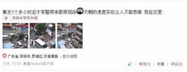 对于警方“3分钟赶到现场”的描述,有目击网友通过微博表示质疑。网友“@没骨气的兜小呆呆”从上午10:13分开始通过微博图文直播事件过程,他于上午11:03分通过微博透露,“事发1个多小时后才有警察来勘察现场”,并称事发后两位受伤者躺在路上长达半小时,路人多次拨打120和110,半小时后,第一辆救护车才到达现场。