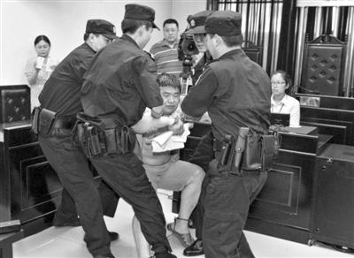 被告人被法警抬出法庭。昨日,被告人在听取宣判后,不肯离开法庭。新京报记者 王贵彬 摄