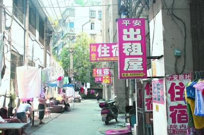硚口区六十二中宿舍楼一楼,“胶囊旅馆”的招牌密密麻麻 记者岳源 摄