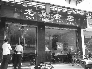 接到报料后,金陵晚报记者随即赶往现场。记者赶到现场时,警方已经在勘查现场,被抢劫的龙凤金店大门紧闭,为了保护现场,已经不让外人进入。记者看到,店的玻璃门窗完好无损。透过玻璃门,记者看到,里面有警察正在搜集证据。记者发现,店面柜台也没有任何破损的痕迹。
