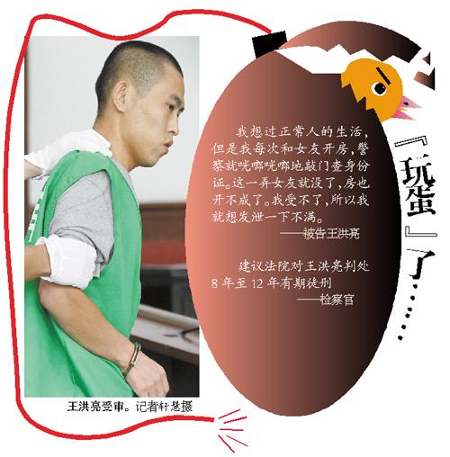 昨日,该案在深圳宝安法院开庭,被告王洪亮在法庭上认罪,并自述犯罪动机:“我想过正常人的生活,但是我每次和女友开房,警察就咣啷咣啷地敲门查身份证。这一弄女友就没了,房也开不成了。我受不了,所以我就想发泄一下不满。”