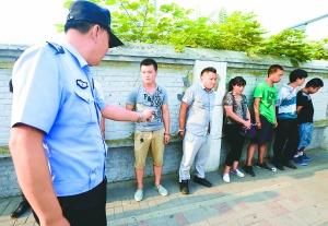 突然,前方一阵骚动,抓捕“有文有武”。记者身前,两名便衣民警将手搭在两名号贩子肩膀上,警告道:“别反抗啊,盯你们半天了。”号贩子还没弄明白情况,怔在原地乖乖就擒。远处有人奋力逃跑,被几名民警围堵抓获,按在墙边。