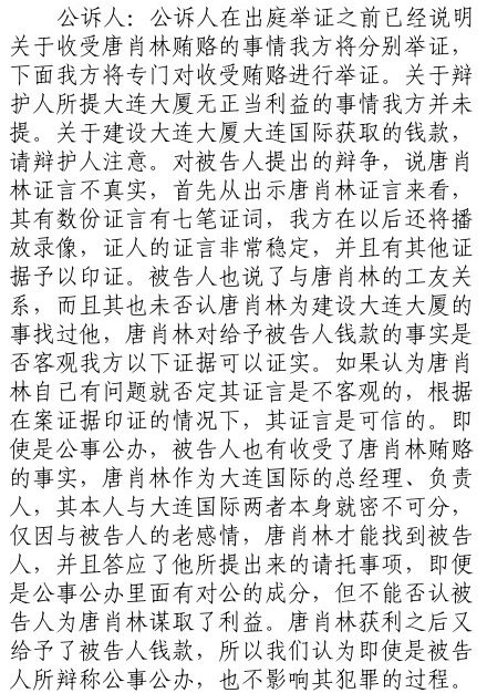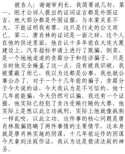被告人辩称,第一、刚才公诉人提出的证词证言都是外围证言,绝大部分都是外围证据,与本案关系不大,不能证明其有罪。第二,唐肖林的证词是一面之辞,在他的供述里自认十多年前在大连大厦建设上、汽车指标申请上进行了欺骗、倒卖,是一个地地道道的贪腐分子和经济骗子,只是当时他完全掩盖了这一点,没有被识破,所以自己当公事公办。