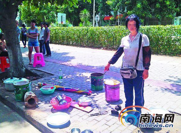 22日上午10点,记者赶到秀华路省人民医院附近看到,事发地点一片狼藉,锅碗瓢盆撒了一地。当事摊主陈女士告诉记者:“我像以前一样,每天上午在医院门前公交站附近卖海南粉。今天7点半,一辆秀英城管的执法车来到这里后,3名城管队员下来就冲到我的摊位,强行没收了我的餐具。”陈女士说,当时她与随后赶到的丈夫与城管队员理论,认为自己已经准备离开,为何还要没收东西,而且为何执法人员只针对自己,不抓其他摊贩。