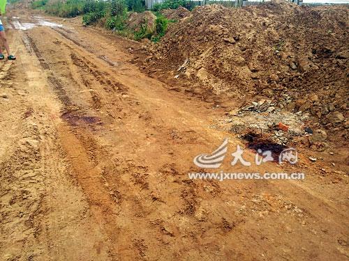 当日11时50分,记者赶到案发地点时,出租车和邓某都已被运走。记者发现,进入案发地点要从赣江市民公园三期工地穿过,然后顺着一条土路来到老赣江北大道上,而原先的混凝土路面已经被凿烂,路面两侧堆放着成堆的沙土。在一处路面上,两摊血迹已经发黑变干。