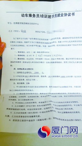 去年8月,家住莆田的小云(化名)看到一份“浩博教育集团动车乘务员培训班”的招生简章,称这个培训中心“专为我国动车系统培养、输送高素质人才。”小云一家觉得机会不错,很快就交了15000元钱,并与招生方签订一份《动车乘务员培训班学员就业协议书》(以下简称“就业协议”)。