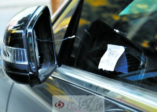 轿车的后视镜镜片已被抠掉,车窗上留下一张字条。