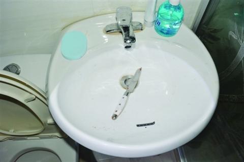 嫌疑人作案后将水果 刀清洗后丢在盥洗池中。