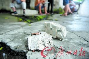 在附近仓库工作的吴先生指着地上一块足有六七斤重的石块回忆,昨日中午12时左右,自己正蹲在仓库对出马路旁的树边享受盒饭,突然“嘣”一声巨响,一块“比拳头还大的砖块”掉落在离自己不足3米开外的过道上,老吴至今心有余悸。
