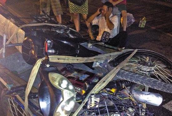 昨晚9时许,记者来到现场,事主老黄坐在马路边的人行道上,他的面前有一辆三轮车,上面载着一辆前轮已变形的电动车。回想起事情经过,老黄既无奈又气愤:“今晚大约8时20分,我在停车场出口处正准备入内,一辆小车从停车场冲了出来。”老黄说,他还没反应过来,他骑的电动车就被小车撞倒。“我从车上摔下来,一屁股坐在地上,整条脊椎骨都被摔得发麻,坐在地上起不来。”小车并没有停下来,一踩油门便呼啸而去。老黄打电话报警求助。