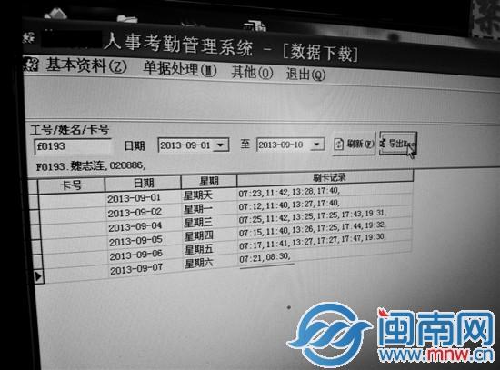 昨日下午4点半左右,记者找到魏志连所在的企业。“魏志连从2013年3月11日进入该公司,从事货品计量工作。”该企业一名负责考勤工作的工作人员说,该企业员工上下班、请假早退,都要刷卡。