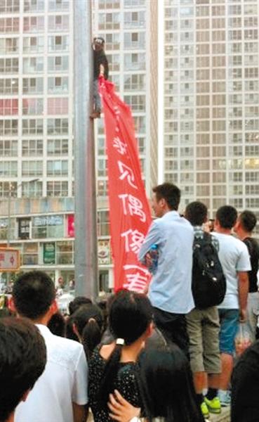 昨日17时40分许,国贸景恒街路口,一名男子爬上街边电线杆,打出条幅称“求见偶像秦海璐”。一小时后,该男子被民警和消防队员成功救下。