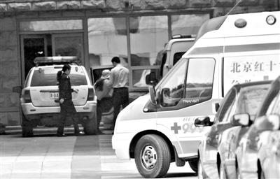 丁书苗被法警扶下警车,旁边停着一辆待命的急救车。昨日,丁书苗涉嫌行贿和非法经营案在市二中院开庭。新京报记者 王贵彬 摄