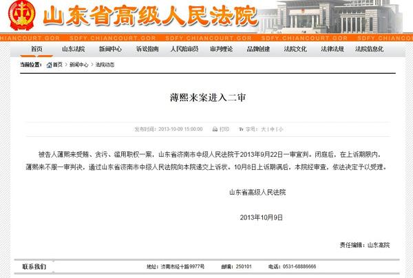 中共中央政治局原委员、重庆市委原书记薄熙来受贿、贪污、滥用职权一案,济南市中级人民法院于2013年9月22日一审宣判。薄熙来提出上诉,山东省高级人民法院已于今日立案受理。
