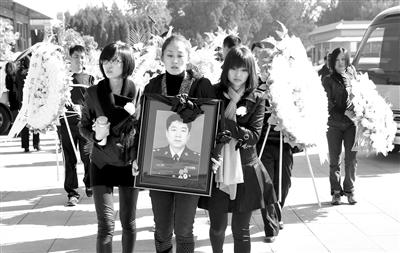 昨日,八宝山革命公墓告别厅,因公牺牲刑警赵晓平的爱人(中)怀抱丈夫遗像走出告别大厅。新京报记者 尹亚飞 摄
