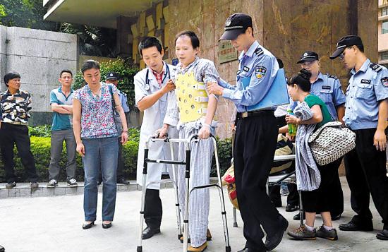 经警察劝说,伤者答应先回医院 朱文海 摄
