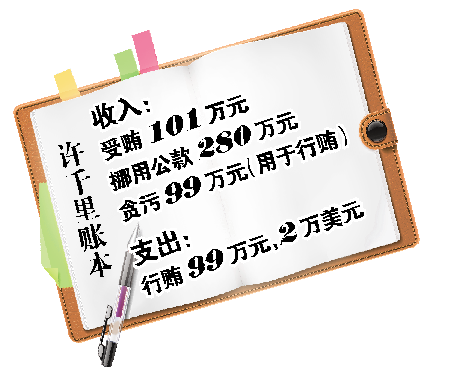 事实上,许千里尽管行贿款甚巨,但实际上绝大多数款项都并非“自掏腰包”。2007年6月至2011年5月,许千里利用分管福彩中心的职务便利,侵吞福彩中心公款共计人民币99.1364万元,用于个人行贿。