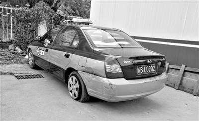 昨日,被撞爆胎的“克隆”出租车,停在朝阳交通支队奥运村大队院内。新京报记者 黄月 摄