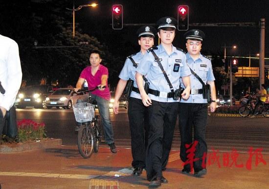 东莞市南城鸿福路一队巡警正接近指定签到点 羊城晚报记者 王俊伟 摄