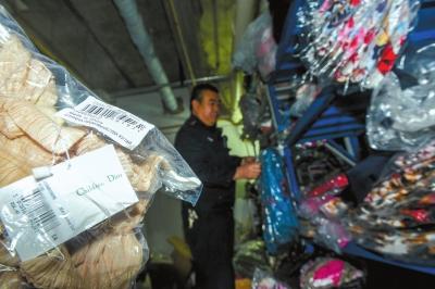 民警在现场查获大量仿冒名牌童装。京华时报记者蒲东峰摄