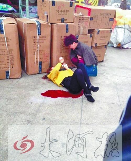 广场上搭建的销售床上用品的大棚旁有一大摊血迹,商场一位保安正在清理地上的血迹。而金水路派出所的两名民警正在向周围的目击者了解情况。