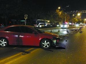 轿车撞了护栏剐了出租 肇事女司机光着脚丫逃跑