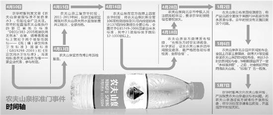 “标准门”事件一般被认为始于4月10日,当时,京华时报刊登《农夫山泉被指标准不如自来水》一文,内容主要是:农夫山泉执行的浙江“DB33/383-2005瓶装饮用天然水”标准中,关于有害物质的限量,低于国家《生活饮用水卫生标准》。
